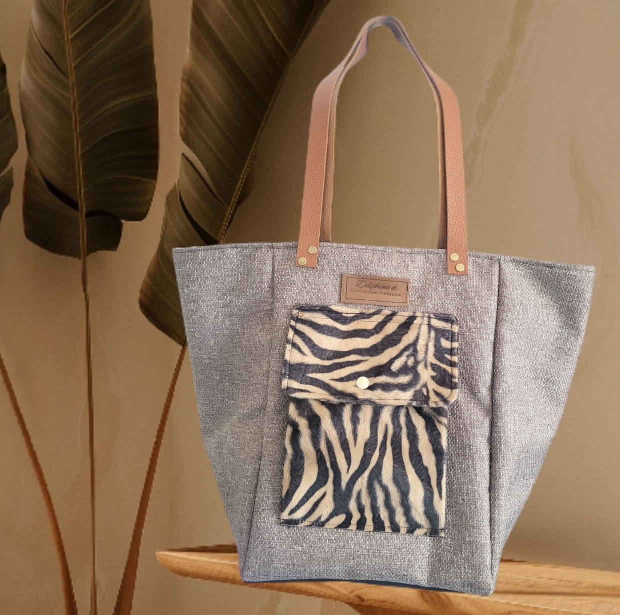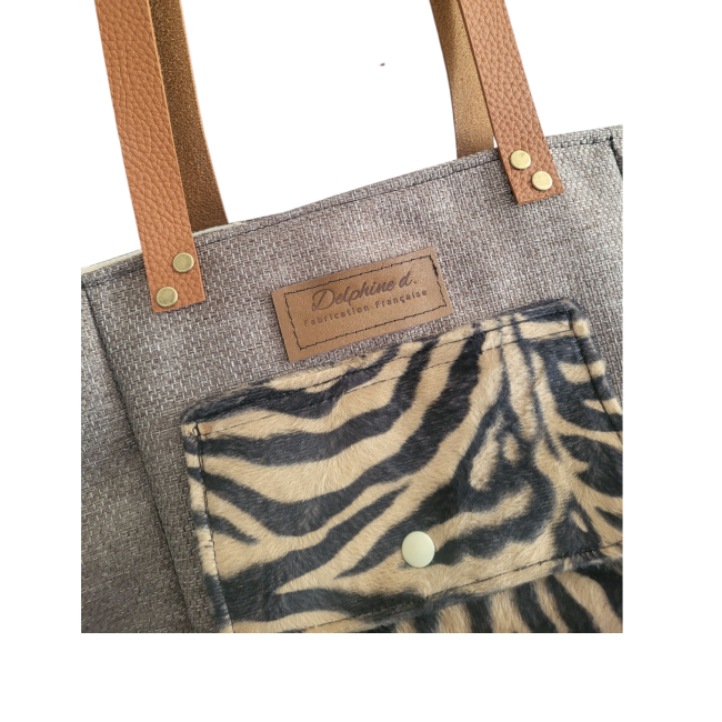SAC CABAS taupe avec poche en fausse fourrure zebrée.