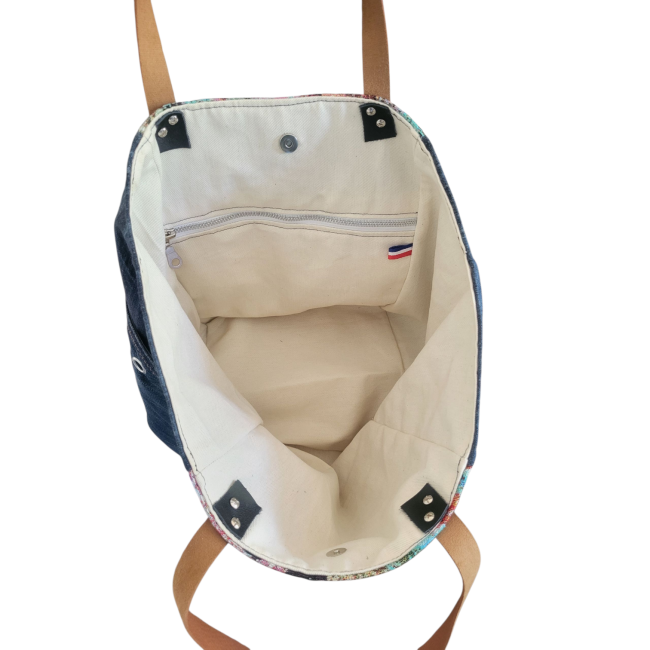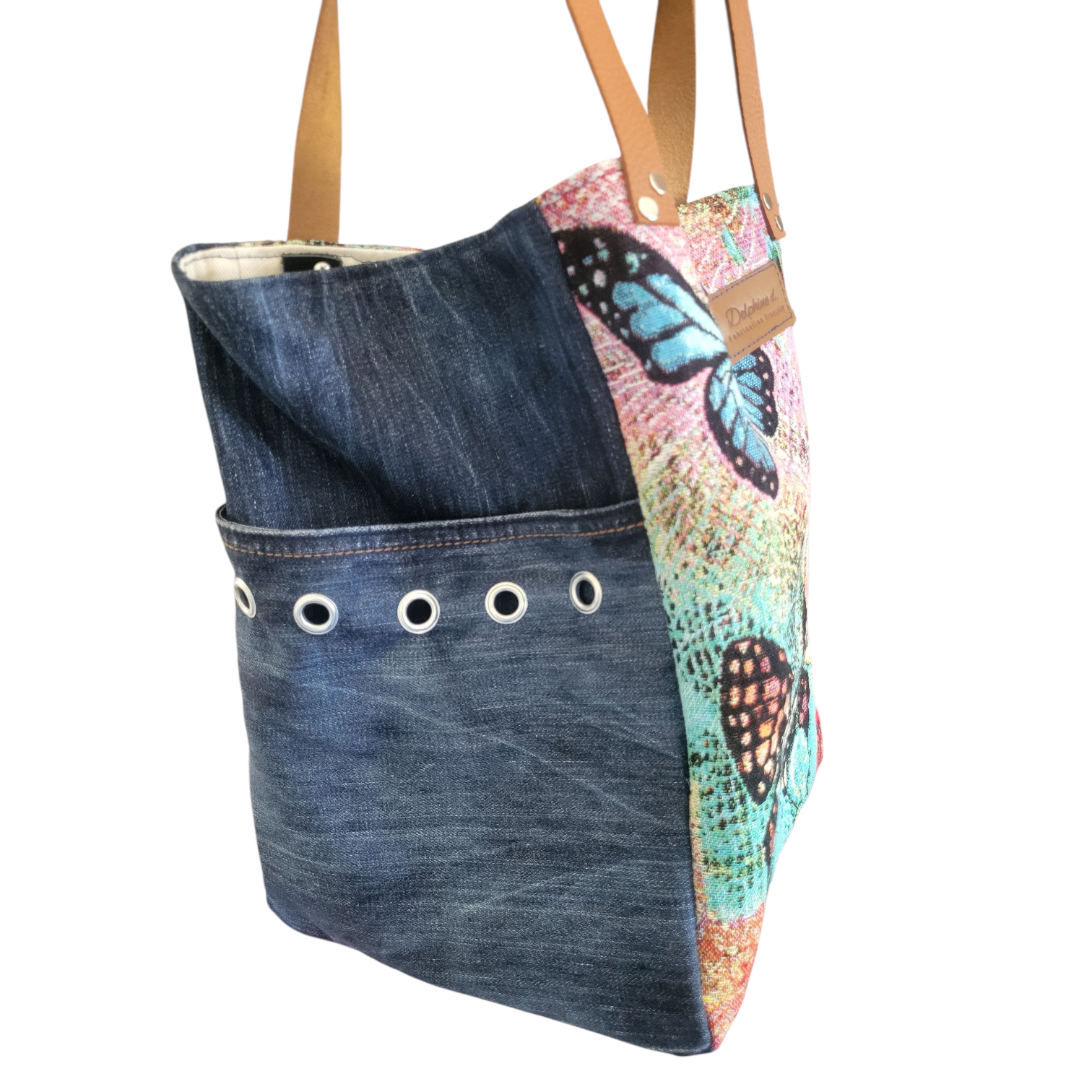 SAC CABAS Jeans et toile papillons avec une poche sur le coté avec oeillets argentés.